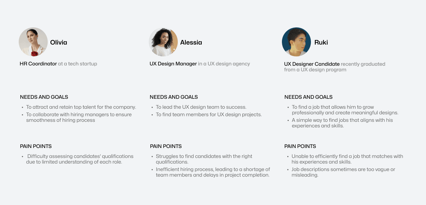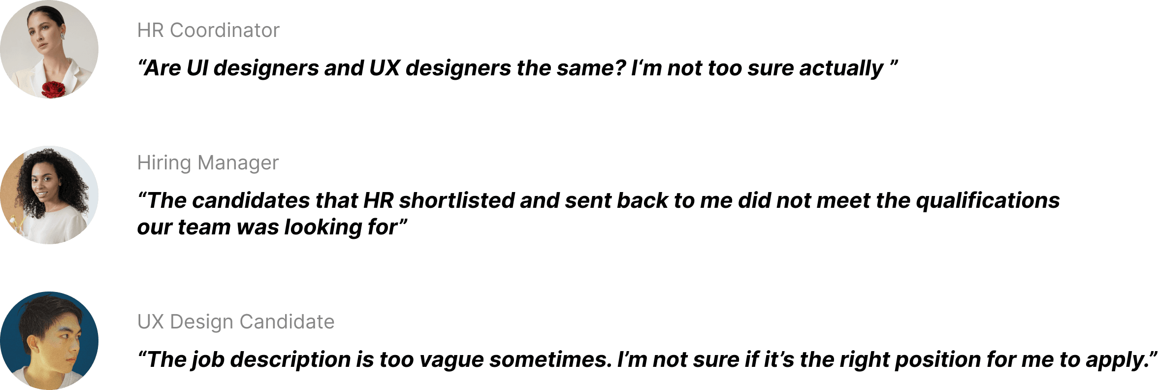 We conducted 5 user interviews with HR Coordinator, Hiring Managers, and Designers. Below are some of our interview highlights: