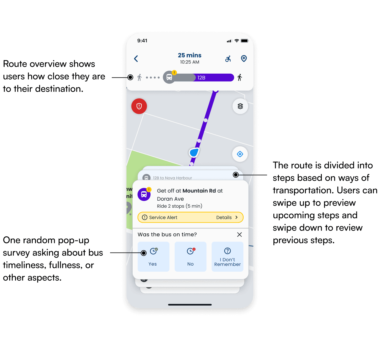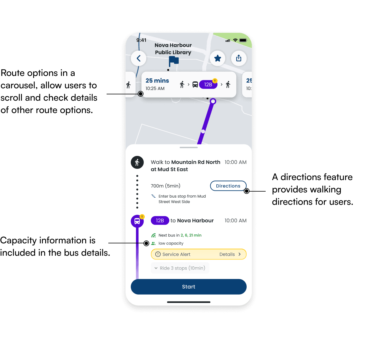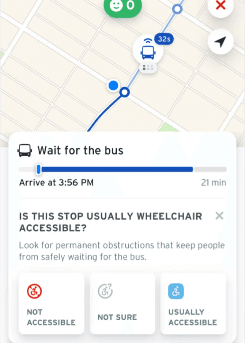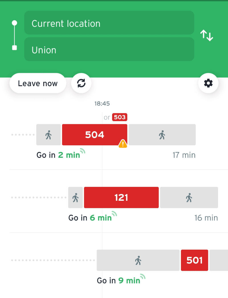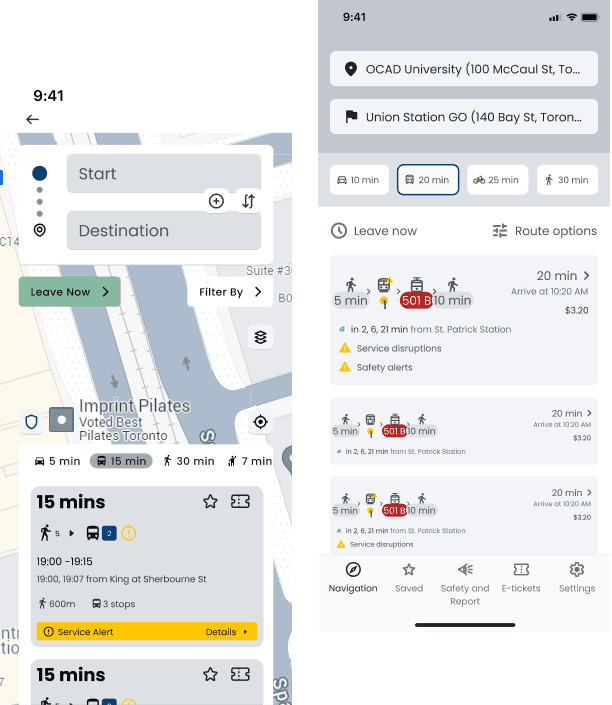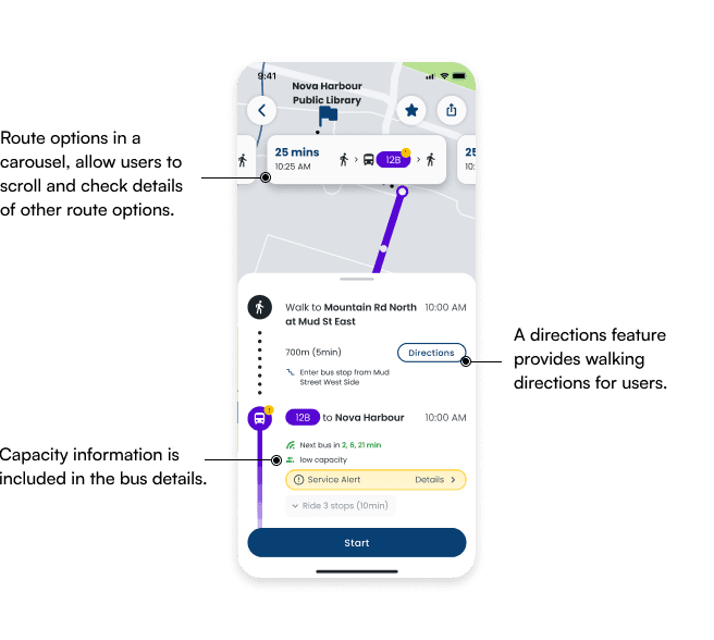 We experimented with displaying the user's current location in the background but found it distracting, as the map competed with the route details, making it harder for users to focus on their options.