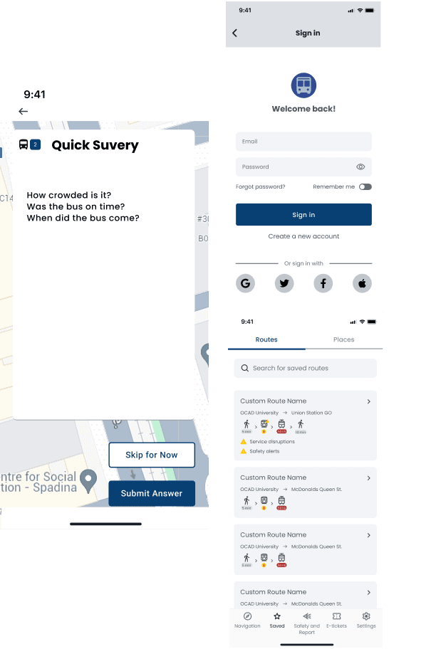 Users log in, choose a destination, explore route options, and view detailed route steps. The live navigation feature guides users through their journey with clear, interactive instructions, while a lightweight survey gathers feedback without disrupting the flow.