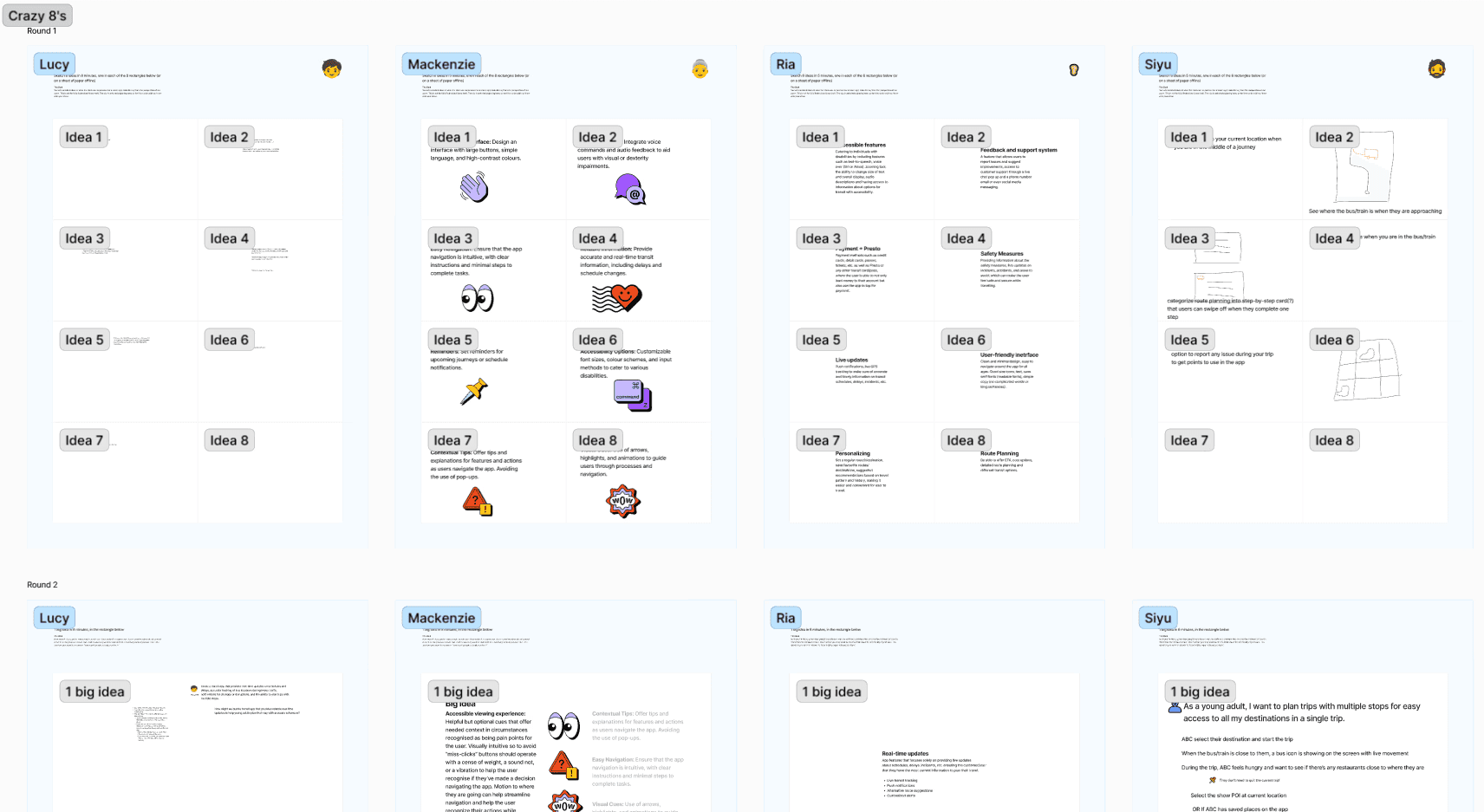 Based on the research and user pain points, we used the Crazy 8's brainstorming technique. Each team members were challenged to sketch eight distinct solutions in eight minutes.