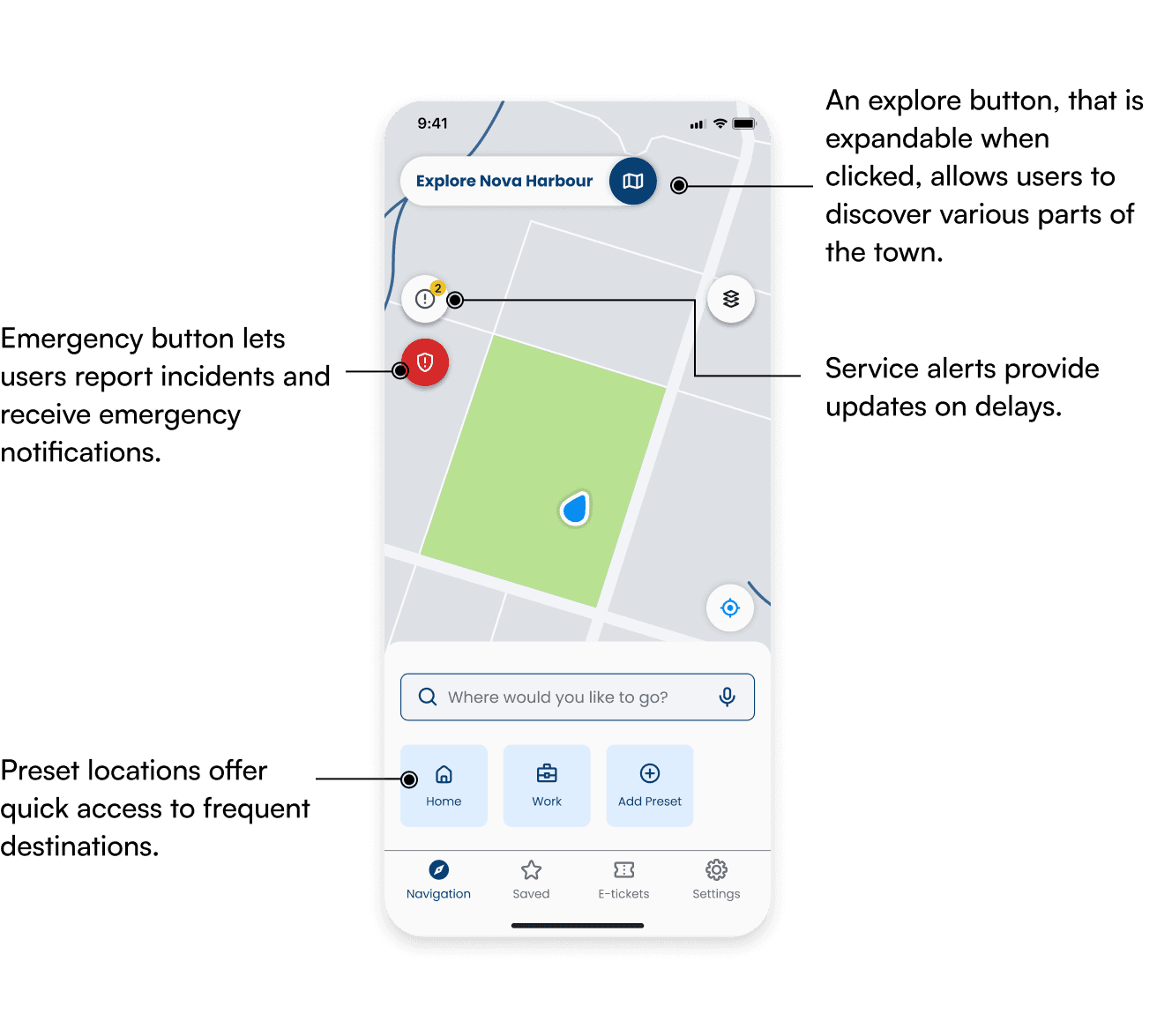 For the home screen, we found rectangular tabs clearer than rounded ones, as they kept icons and labels connected. Listing saved locations first also proved more effective than categorizing saved places and nearby attractions, offering quicker access to frequent spots.